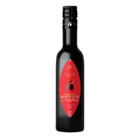 „Noir d’Olive“ – „Schwarzes von der Olive“ : natives Olivenöl, geschützte Herkunft aus dem Tal der „Baux de Provence“ Flasche 250ml mit einem integrierter Ausgießer