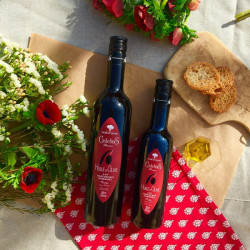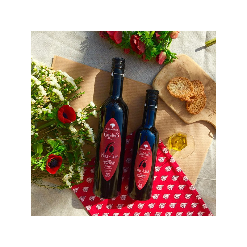 Die Mühle „CastelaS“ hat die traditionellen Herstellungsmethoden der Altmeister des Tals „Baux de Provence“ überarbeitet, um „Noir d’Olive“ zu kreieren. Dieses Olivenöl setzt sich aus 4 Olivenarten zusammen, die in unseren Plantagen erst gepflückt und dann in luftdichten Steigen aufbewahrt werden, wenn sie vollkommen reif sind. Danach setzt ein empfindlicher aber leichter Gärungsprozess ein, der es zusammen mit Fachwissen ermöglicht, denselben Geschmack zu erlangen wie die eingelegten schwarzen Oliven, die in den Mühlen unserer Vorfahren entstanden. Die gesamte Kunst besteht darin, diese Urtümlichkeit zu erlangen und zugleich ihre Mängel zu beheben.