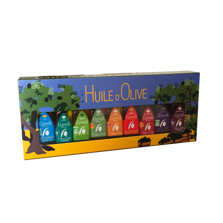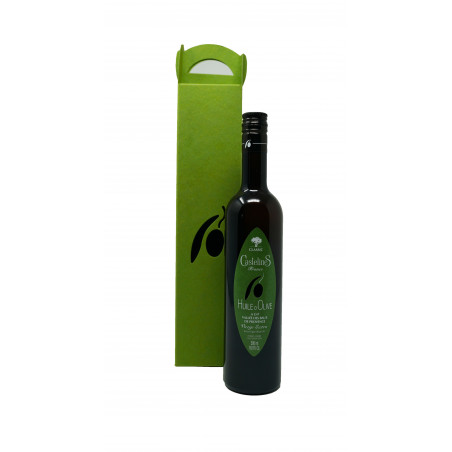 Rot geschenk Verpackung mit einer 500ml Flasche von Noir d'olive „Schwarzes von der Olive“ (vormals „Fruchtig Schwarzes“): natives Olivenöl, geschützte Herkunft aus dem Tal der „Baux de Provence“