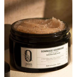 Zutaten : Extra natives Olivenöl von Domaine de Leos, Süsses Mandelöl, Pulverisierte Oliven-, Aprikosen- und Mandelkerne, Zuckerkristalle.