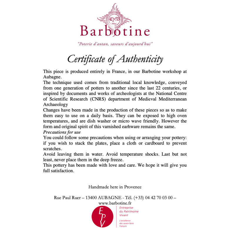 This piece is produced in France, at Barbotine workshop in Aubagne.