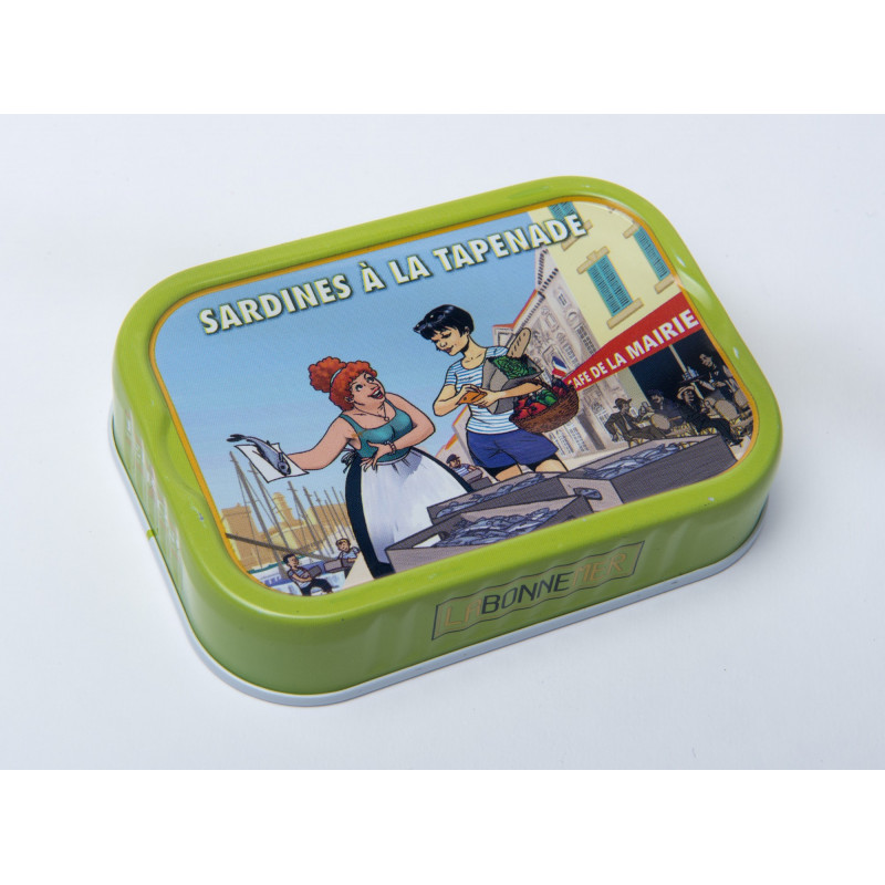 Sardines 70%, tapenade 26% (olives noires, huile d'olive vierge extra, anchois, câpres, plantes aromatiques), huile de tournesol, sel
